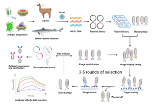 1.文库构建:将外源 DNA 片段(如抗体可变区 VHH、随机肽库)插入 pIII 或 pVIII 基因,构建噬菌体展示载体(如 M13 phagemid)。
